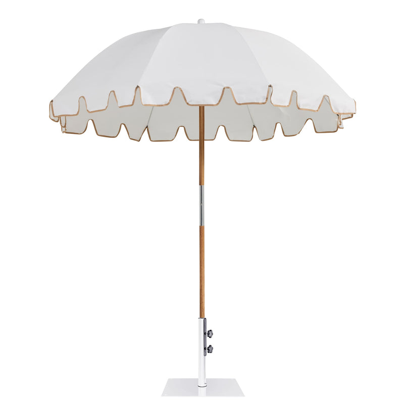 Elevate your exterior decor and functionality with Basil Bangs' Weekend Umbrella and 31lb White Square Base set. Ideal for enriching your outdoor haven—be it your garden, balcony, or poolside—with comfort and shade.